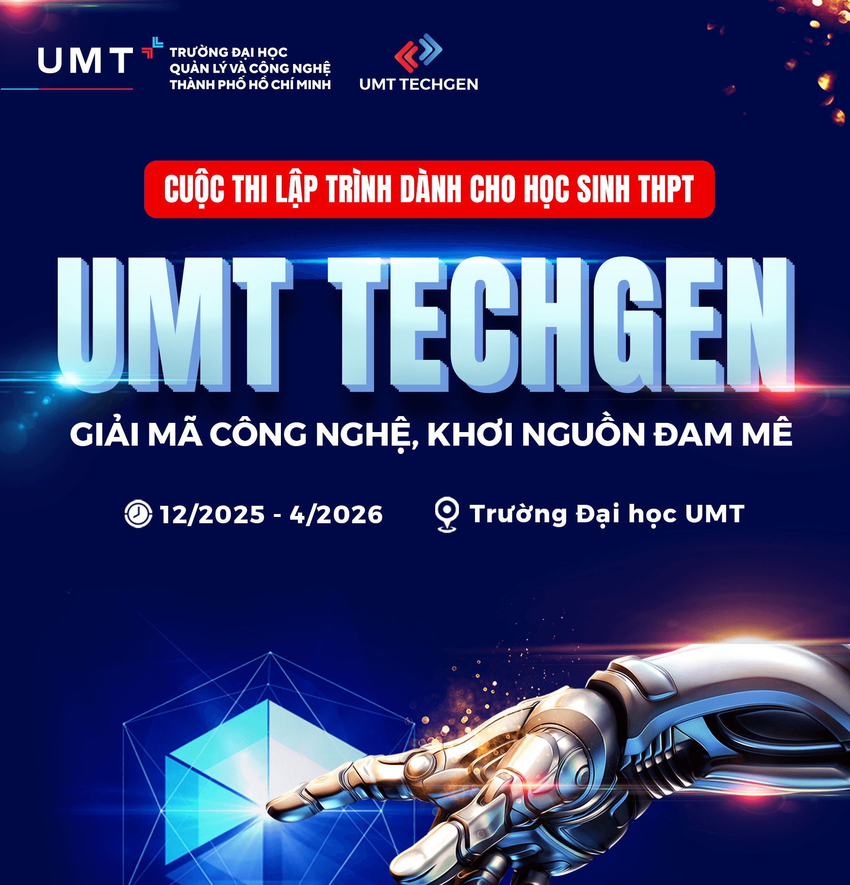 Cuộc thi UMT TechGen lần đầu tiên được tổ chức bởi Trường Đại học Quản lý và Công nghệ TP.HCM (UMT), mang đến một sân chơi học thuật chuyên sâu dành cho học sinh THPT đam mê Toán – Tin và Công nghệ thông tin. Cuộc thi giúp thí sinh khám phá năng lực lập trình, tiếp cận hệ thống đề thi chất lượng và trải nghiệm mô hình thi theo chuẩn đại học.