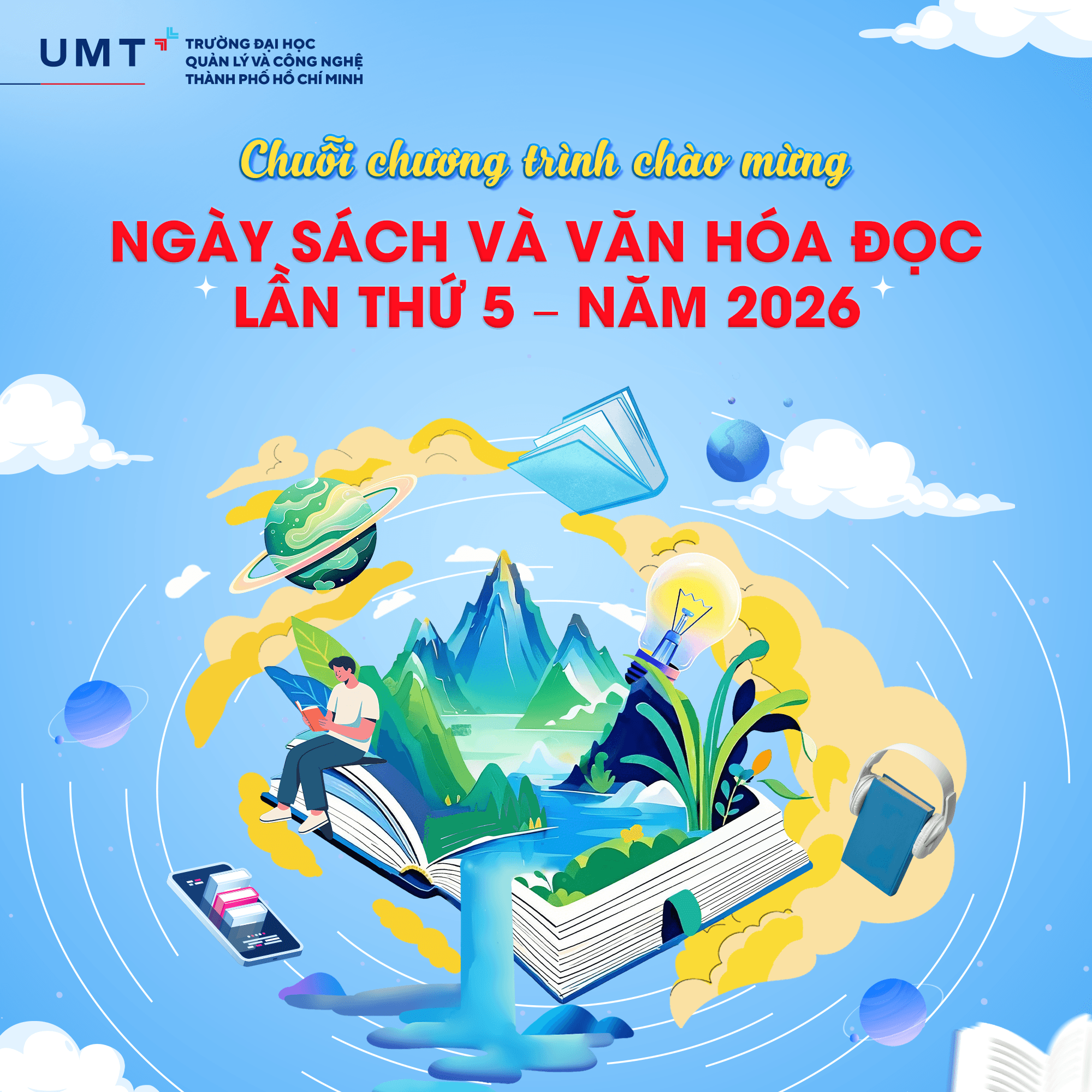 Hưởng ứng Ngày Sách và Văn hóa đọc Việt Nam, Trường Đại học Quản lý và Công nghệ TP.HCM (UMT) triển khai chuỗi hoạt động ý nghĩa diễn ra từ 12/5 đến 22/5/2026, với mong muốn lan tỏa tinh thần đọc sách trong cộng đồng sinh viên, đồng thời khơi dậy niềm cảm hứng học tập, khám phá và phát triển bản thân thông qua tri thức.