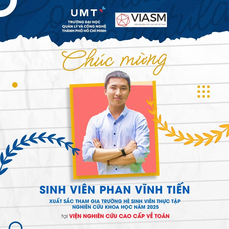 Vượt qua nhiều tiêu chí tuyển chọn khắt khe và với Thư giới thiệu của ThS. Nguyễn Quản Bá Hồng - Giảng viên bộ môn Khoa học Dữ liệu, Khoa Công nghệ UMT; Sinh viên Phan Vĩnh Tiến - Khóa 1 ngành Công nghệ thông tin, đã xuất sắc trở thành 1 trong 50 sinh viên tham gia đợt đầu tiên (ngày 18/8 - 23/8/2025) tại VIASM REU 2025.