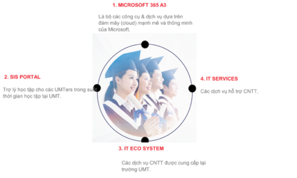Bạn có thể giữ liên lạc với UMT từ mọi nơi, mọi lúc; luôn cập nhật các cổng và ứng dụng trực tuyến của UMT bằng các dịch vụ tiêu biểu như Microsoft 365 A3, SIS Portal, IT ECO System, IT Services