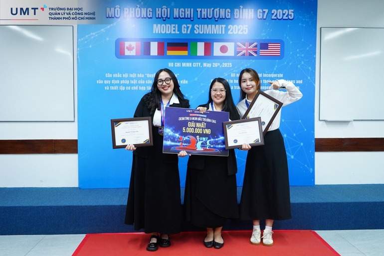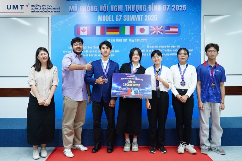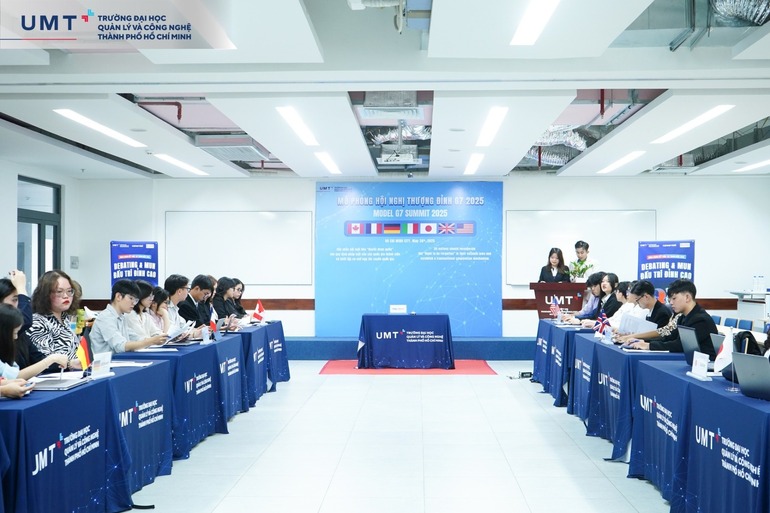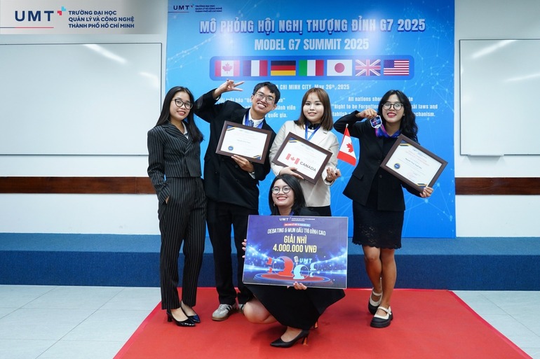 Sau hai vòng tranh biện đầy kịch tính, Vòng chung kết cuộc thi UMT Debate 2025 đã chính thức khép lại với phần thi mô phỏng Hội nghị Thượng đỉnh G7, mang đến màn đối đầu đỉnh cao giữa những “nhà lãnh đạo trẻ” đến từ 7 đội thi xuất sắc nhất.