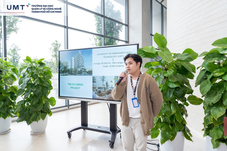 Bạn Trần Đại Phúc - Sinh viên năm nhất ngành Kinh doanh quốc tế đại diện trình bày bằng tiếng Anh về Dự án Go Green của UMT.