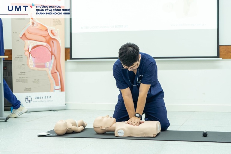 Tại đây, các bác sĩ của Wellbeing đã có những chia sẻ vô cùng bổ ích về các kỹ năng sơ cấp cứu cho những trường hợp tai nạn phổ biến nhất. Kèm theo đó, đội ngũ bác sĩ đã hướng dẫn các UMTers thực hành trên các mô hình có tích hợp tính điểm tự động tương ứng với từng đối tượng nạn nhân khác nhau. Ngoài ra, bác sĩ còn trình bày thêm về một số sai lầm trong xử trí để GVNV và các bạn sinh viên tránh mắc phải trong quá trình sơ cấp cứu.