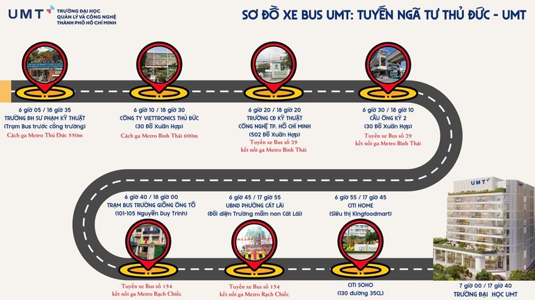 Trường UMT hiện có các tuyến xe buýt đưa đón sinh viên gần các trạm Metro theo lịch trình như sau: