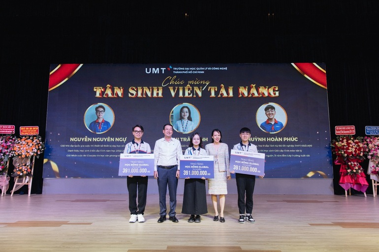 Đại diện UMT. ThS. Huỳnh Thúy Phương - Phó Chủ tịch Hội đồng Trường, Phó Hiệu trưởng UMT và Đại diện đại biểu, Ông Nguyễn Hoàng - Chủ tịch Tập đoàn N&G Group trao tặng học bổng Global đến 3 Tân sinh viên tài năng.