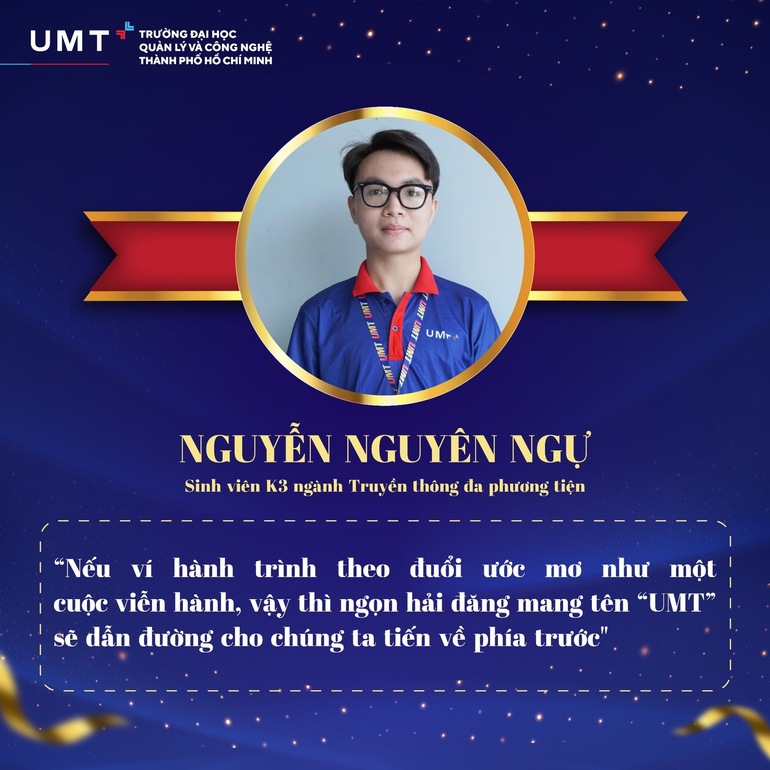 Nếu ví hành trình theo đuổi ước mơ như một cuộc viễn hành, vậy thì ngọn hải đăng mang tên “UMT” sẽ dẫn đường cho chúng ta tiến về phía trước. Khi đứng trước lựa chọn quan trọng về nơi mình sẽ gắn bó trong những năm tháng sắp tới, em đã tìm kiếm một ngọn hải đăng dẫn lối, một nơi không chỉ cung cấp kiến thức mà còn thắp sáng những đam mê và ước mơ. Trường Đại học Quản lý và Công nghệ TP.HCM chính là ngôi trường em tìm kiếm. Trải qua thời gian ngắn ngủi từ ngày 26/8 đến nay, UMT không chỉ là nơi em có thể trang bị cho mình những kiến thức quý giá, mà còn là nơi em tìm thấy sự kết nối sâu sắc với những giá trị và lý tưởng mà em theo đuổi.