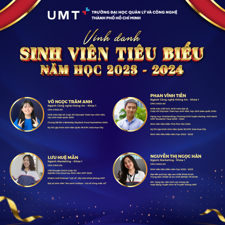 Năm học cũ đã khép lại với nhiều dấu ấn đặc biệt, trong đó những nỗ lực trong học tập và rèn luyện của các bạn sinh viên góp một phần không nhỏ vào những thành công đó. Với sự tích cực, tinh thần cầu tiến và sự cố gắng không ngừng, nhiều thành tích ấn tượng của UMTers đã tiếp tục được ghi danh vào bảng vàng thành tích UMT. Nhà trường đã xét chọn và tuyên dương 4 sinh viên Khóa 1 và 6 sinh viên Khóa 2 xuất sắc, gồm: