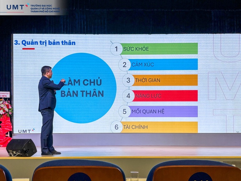 Bước tiếp theo quan trọng nhất được Thầy nhấn mạnh sau khi định vị mục tiêu, đó là Quản trị bản thân. Thầy cho rằng để đạt được thành công và hạnh phúc, mỗi người cần rèn luyện trên sáu trụ cột nền tảng: sức khỏe, cảm xúc, năng lực, tài chính, mối quan hệ và thời gian. Đây là hành trang quý giá giúp sinh viên tiến bộ trong học tập và trưởng thành hơn trong cuộc sống. Khi các trụ cột này được cân bằng, con người sẽ có đủ nền tảng để chạm tới mục tiêu cao nhất: hạnh phúc và thành công.