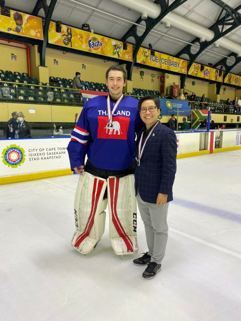 TS. Jane Nguyễn với vai trò là Trưởng đoàn Thái Lan cùng vận động viên môn Khúc côn cầu trên băng (Ice Hockey) của Thái Lan trong Giải Cúp Thế Giới tháng 3/2022 tại Nam Phi