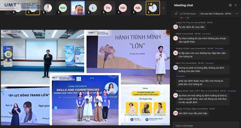 Mở đầu chương trình, ThS. Bùi Phan Khánh - Phó Trưởng Phòng Công tác sinh viên UMT, giới thiệu mô hình hướng nghiệp U-M-T, gồm ba bước cốt lõi: Unlock - Match - Transform. Thông qua những ví dụ gần gũi, Thầy nhấn mạnh tầm quan trọng của việc thấu hiểu bản thân, nhận diện điểm mạnh, giá trị và sở thích cá nhân của mỗi bạn học sinh. Từ đó, các bạn kết nối chúng với ngành học, nghề nghiệp và chuyển hóa định hướng thành lộ trình hành động cụ thể trong tương lai. Đây cũng là yếu tố quan trọng để giúp học sinh phát triển kỹ năng tự định hướng (một trong những năng lực thiết yếu của công dân thời đại số).