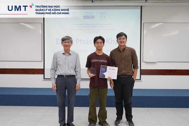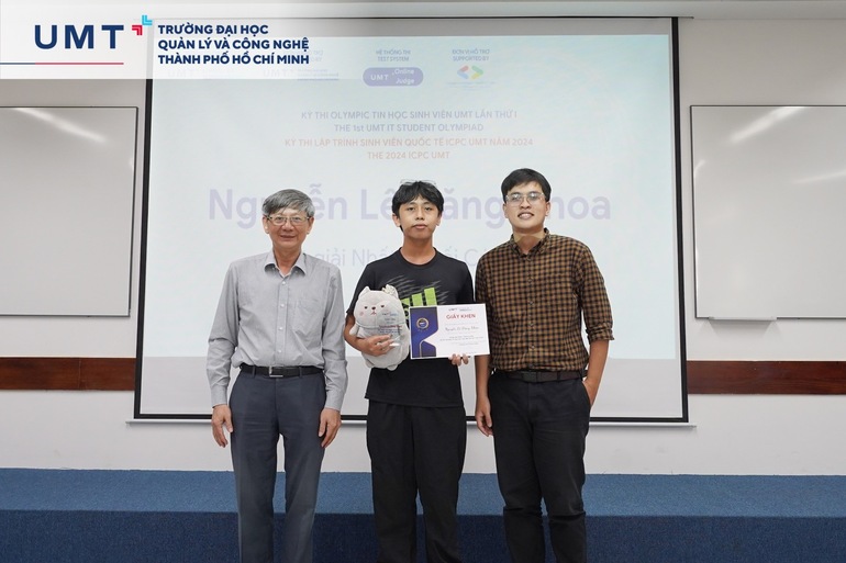 Ngày 9/10/2024, kỳ thi ICPC đã diễn ra với thời gian làm bài 300 phút, yêu cầu sự phối hợp ăn ý giữa các thành viên đội nhóm. Đội rollingInTheHeap (gồm 3 sinh viên ngành CNTT: Đặng Phúc An Khang K2, Võ Ngọc Trâm Anh K1, Nguyễn Lê Đăng Khoa K2) đã xuất sắc giành ngôi vị “Vô địch ICPC UMT 2024” nhờ khả năng giải quyết nhanh chóng và chính xác nhiều bài thi hóc búa.
