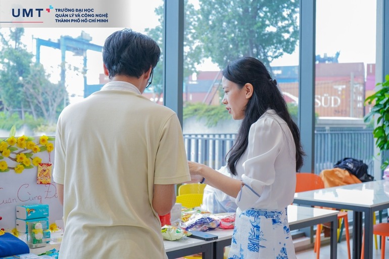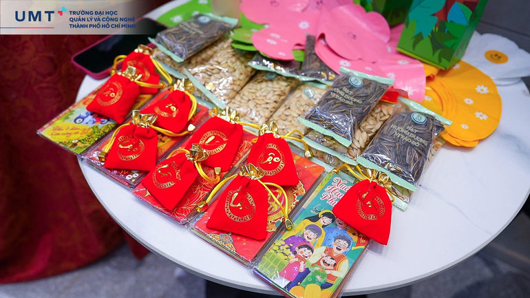 Điểm nhấn đặc biệt của Hội Xuân năm nay chính là Phiên chợ Tết đầy màu sắc, mang đậm nét văn hóa Việt Nam. Các gian hàng được trang trí rực rỡ, bày bán đủ loại sản phẩm đặc trưng ngày Tết, từ bánh mứt truyền thống, đồ thủ công mỹ nghệ đến những món ăn dân dã. Phiên chợ không chỉ là nơi để thưởng thức hương vị Tết mà còn thể hiện sự sáng tạo và nhiệt huyết của các thành viên Nhà UMT.