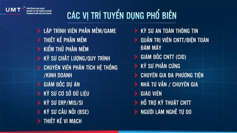 Ngoài những công việc liên quan đến phần cứng, Việt Nam rất mạnh về phần mềm. Do đó, sinh viên ngành CNTT có thể có nhiều cơ hội việc làm như: Lập trình viên, viết phần mềm công nghệ, kiểm duyệt chất lượng phần mềm, quản trị mạng, quản trị dữ liệu, kỹ sư AI chuyên nghiên cứu trí tuệ nhân tạo và ứng dụng liên quan… Các bạn cũng có nhiều cơ hội thăng tiến lên các vị trí quản lý cấp cao hoặc tự khởi nghiệp kinh doanh ngành nghề liên quan đến công nghệ thông tin”.