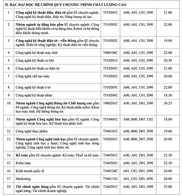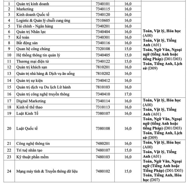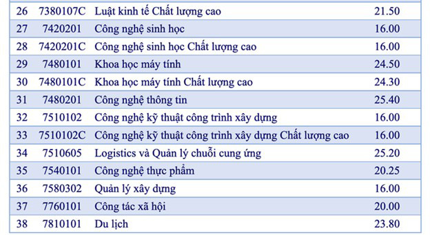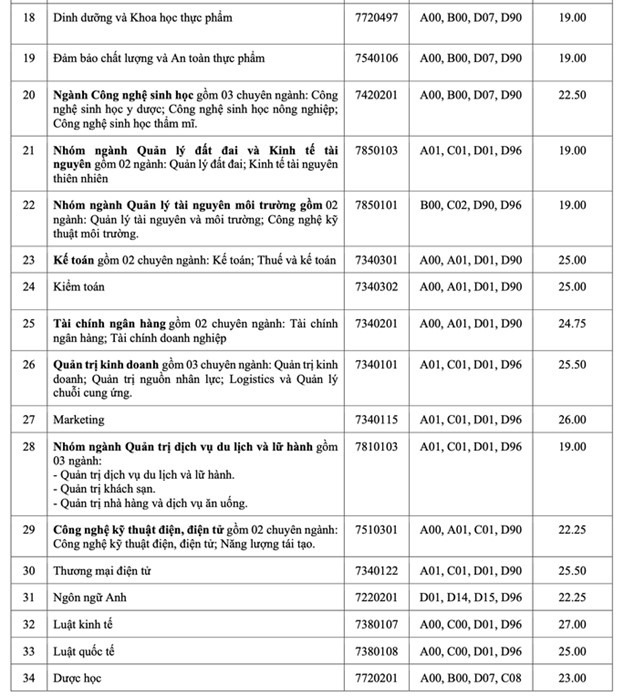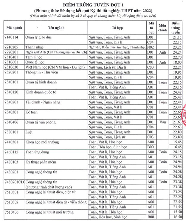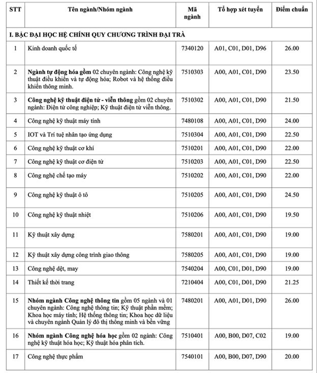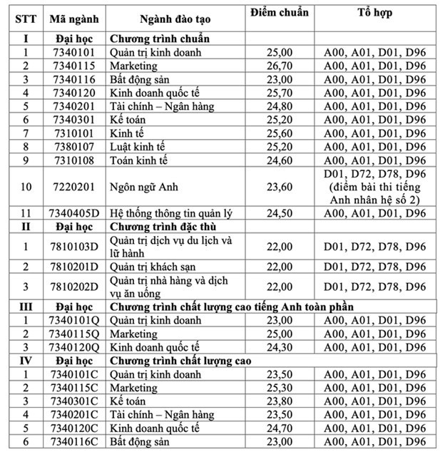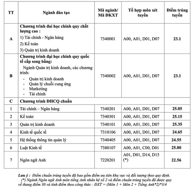 Điểm trúng tuyển nói trên áp dụng chung cho các tổ hợp xét tuyển của từng ngành theo từng chương trình đào tạo (chương trình chuẩn, chương trình đặc thù, chương trình chất lượng cao, chương trình chất lượng cao tiếng Anh toàn phần).