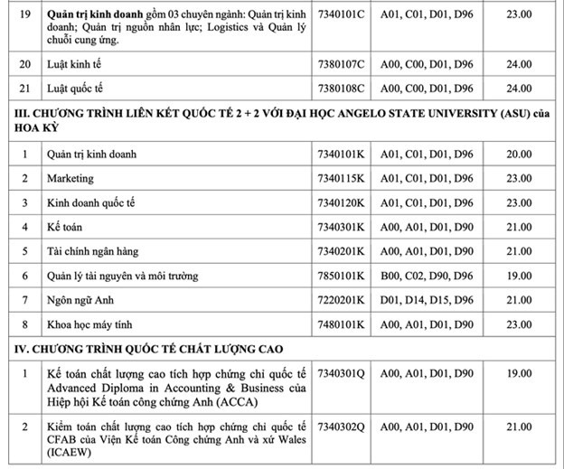 (3) Các ngành Chất lượng cao: Luật kinh tế, Ngôn ngữ Anh, Ngôn ngữ Trung Quốc, Ngôn ngữ Nhật, Quản trị kinh doanh, Tài chính ngân hàng, Kế toán, Kinh tế: Ngoại ngữ hệ số 2.