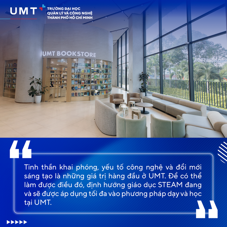 Để có thể làm được điều đó, định hướng giáo dục STEAM (Khoa học, Công nghệ, Kỹ thuật, Nghệ thuật, Toán học) đang và sẽ được áp dụng tối đa vào phương pháp dạy và học tại UMT. Chúng tôi tin rằng, sự giao thoa và kết nối liên ngành sẽ giúp sinh viên phát triển tư duy quốc tế, sáng tạo đột phá và phát huy năng lực giải quyết vấn đề phức tạp trong bối cảnh toàn cầu.