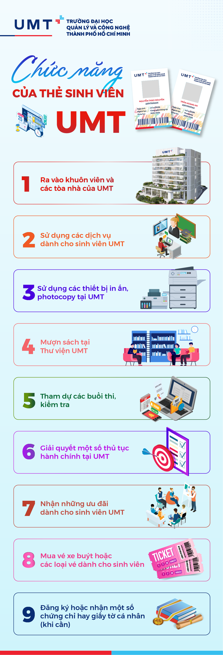 1. Sinh viên chỉ được cấp Thẻ sinh viên một lần vào đầu khóa học - Vì lý do bảo mật, để bảo đảm an ninh, trật tự và thông tin cá nhân tại UMT.
