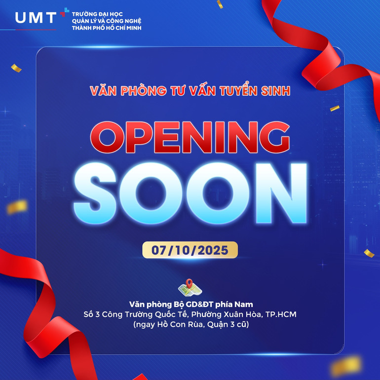 Tin vui: Vào ngày 7/10/2025 sắp tới, Trường Đại học UMT sẽ tổ chức Lễ Khai trương Văn phòng Tư vấn Tuyển sinh tại Văn phòng Bộ GD&ĐT phía Nam – Số 3 Công Trường Quốc Tế, Phường Xuân Hòa, TP.HCM.