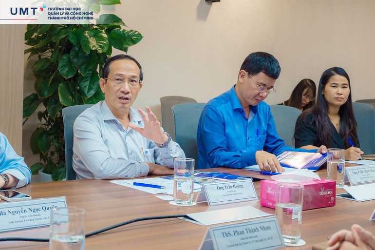 Ông Trần Hoàng - Tổng Biên tập Tạp chí Doanh Nhân Sài Gòn chia sẻ tại buổi gặp gỡ Trường Đại học Quản lý và Công nghệ TP.HCM (UMT).