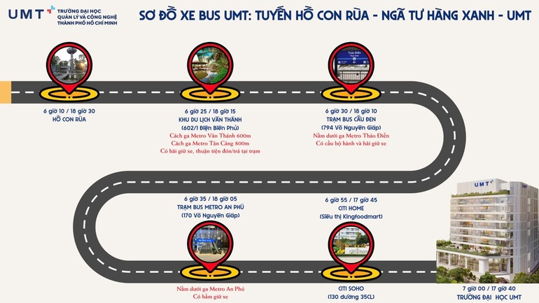 Tin vui dành cho UMTers! Từ năm 2025, UMT chính thức ra mắt thêm lộ trình xe bus mới hoàn toàn miễn phí, kết nối trực tiếp với tuyến Metro, mang đến giải pháp di chuyển tối ưu cho giảng viên, nhân viên và sinh viên.