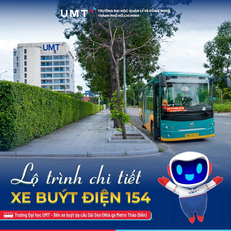 Từ 25/8/2025, trước cổng UMT xuất hiện hình ảnh của những chiếc Xe buýt điện 154 màu xanh - vàng, rộn ràng đưa đón UMTers. Xe buýt 154 kết nối Trường Đại học UMT, cư dân Khu đô thị Cát Lái đến gần hơn với Tuyến Metro tại (Nhà ga Metro Thảo Điền) cùng nhiều trục đường quan trọng của TP. Thủ Đức (cũ) và khu vực trung tâm TP.HCM.