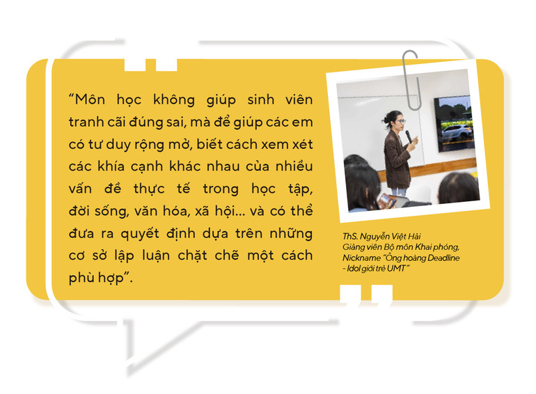 Bạn Võ Thị Ngọc Hân - Sinh viên ngành Marketing: “Mình cảm nhận UMT rất đầu tư khi đưa các môn học Khai phóng vào quá trình giảng dạy cho sinh viên. Con đường này đang đi đúng hướng và mang lại giá trị vô cùng to lớn. Critical Thinking and Argumentations tưởng chừng sẽ hơi buồn ngủ, nhưng với cách dạy mới lạ của Thầy Hải, mình đã có nhiều góc nhìn mới lạ và mình rất nể sự từ tốn cũng như quan tâm đến từng sinh viên của Thầy”.