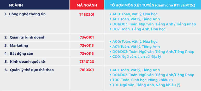 (*) Môn năng khiếu hệ số 2. Thí sinh xem hướng dẫn thi và đăng ký thi môn năng khiếu tại đây.