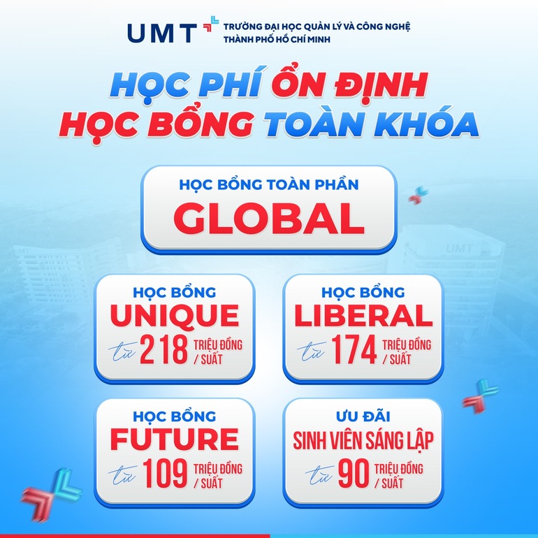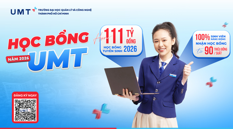 Trường Đại học Quản lý và Công nghệ TP.HCM (UMT) công bố chương trình Học bổng Tuyển sinh 2026 trị giá hơn 111 tỷ đồng, mang đến cho thí sinh cơ hội tiếp cận môi trường giáo dục hiện đại, khai phóng cùng nhiều hỗ trợ tài chính thiết thực.