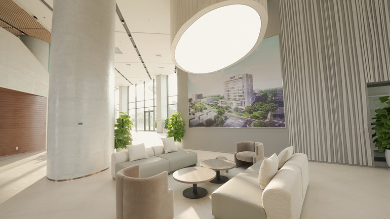 Tòa nhà Sáng tạo UMT với những khung cửa kính cao rộng, giúp ánh sáng luôn tràn ngập, tạo không gian mở và thoải mái.