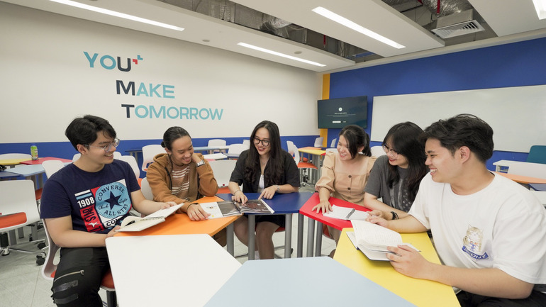 Phòng học có tông màu tươi sáng, mô hình bàn học kiểu mới giúp sinh viên thảo luận nhóm thuận tiện.