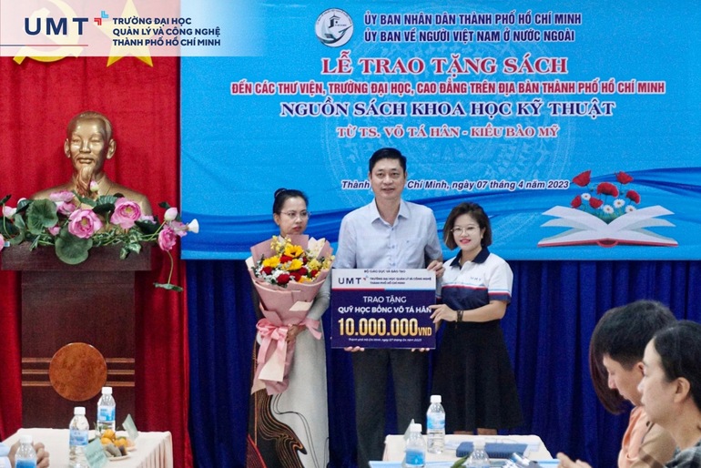 ThS. Nguyễn Thị Phượng, Phó Giám đốc Trung tâm Thông tin Thư viện đã đại diện UMT nhận nguồn sách quý này và trao tặng suất học bổng cho quỹ học bổng Võ Tá Hân tại buổi lễ.