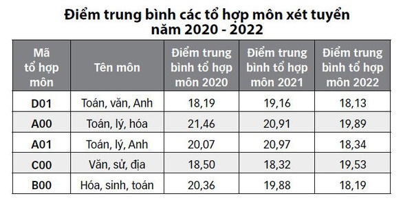 Với phương thức xét tuyển theo điểm thi tốt nghiệp THPT, năm 2022 các trường vẫn chủ yếu xét tuyển theo tổ hợp các môn thi và dự đoán phần lớn thí sinh cũng đăng ký xét tuyển theo các tổ hợp các môn của các khối thi truyền thống. Điểm trung bình các tổ hợp môn xét tuyển năm 2022 giảm trung bình 1 - 1,5 điểm so với năm 2021, ngoại trừ tổ hợp khối C (văn, sử, địa).
