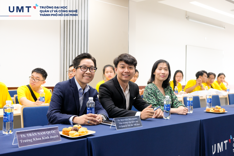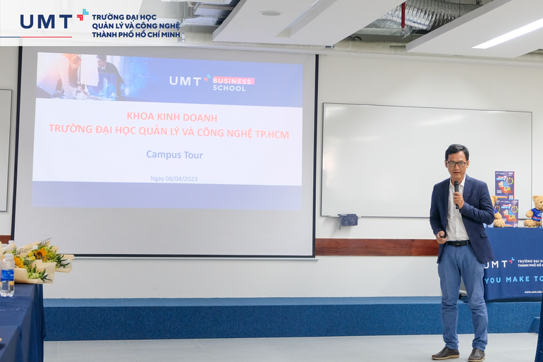 Đón tiếp giáo viên và học sinh tham dự Campus Tour có đại diện Ban Giám hiệu, các Trưởng Khoa/Viện/Bộ môn Trường Đại học UMT: NGND. PGS. TS. Hồ Thanh Phong - Phó Hiệu trưởng, TS. Trần Nam Quốc - Trưởng Khoa Kinh Doanh, TS. Nguyễn Trà Giang - Viện trưởng Viện Khoa học và Quản lý thể dục thể thao, TS. Trịnh Quang Vinh - Trưởng Bộ môn Giáo dục Khai phóng, ThS. Lâm Thùy Trang - Phó trưởng Bộ môn Tiếng Anh.