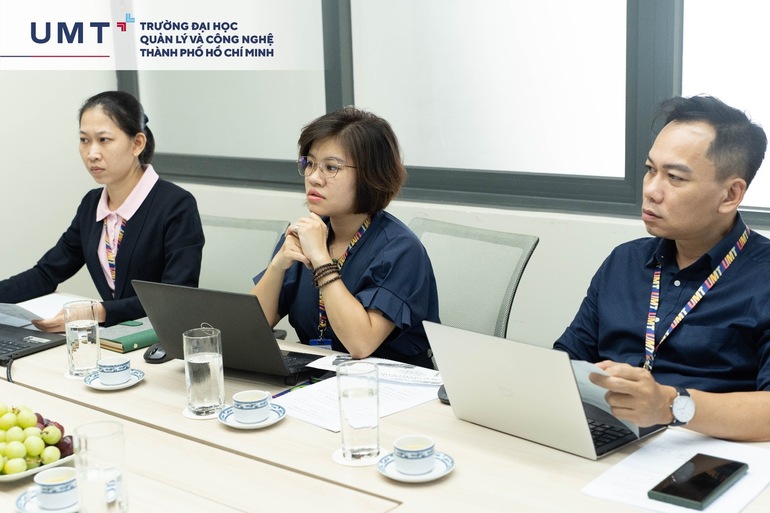 Đại diện UMT, Ông Nguyễn Ngọc Nguyên - Giám đốc Phòng Công nghệ thông tin và Chuyển đổi số (bên trái) và ThS. Nguyễn Thị Phượng, Phó Giám đốc Trung tâm Thông tin Thư viện (ở giữa) trao đổi và làm việc cùng đại diện Trung tâm Thông tin và Thống kê KH&CN TP.HCM (CESTI).