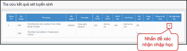 Đối với nguyện vọng đỗ thí sinh có quyền xác nhận nhập học. Để xác nhận nhập học thí sinh nhấn chọn vào nút “Xác nhận nhập học” như hình dưới: