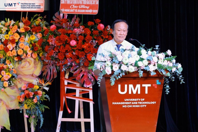 TS. Huỳnh Bá Lân – Hiệu trưởng UMT nhấn mạnh: “Mối quan hệ giữa trường đại học và doanh nghiệp cần được nâng tầm thành sự đồng kiến tạo – nơi sinh viên được học sát thực tiễn, doanh nghiệp có nhân lực chất lượng cao, và nhà trường trở thành trung tâm tri thức và đổi mới sáng tạo.”