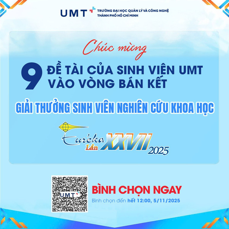 Trường Đại học Quản lý và Công nghệ TP.HCM (UMT) vô cùng tự hào khi 9 đề tài nghiên cứu của sinh viên đã chính thức góp mặt tại Vòng Bán kết Giải thưởng Sinh viên Nghiên cứu Khoa học - Euréka 2025, do Thành Đoàn TP.HCM và Đại học Quốc gia TP.HCM tổ chức.
