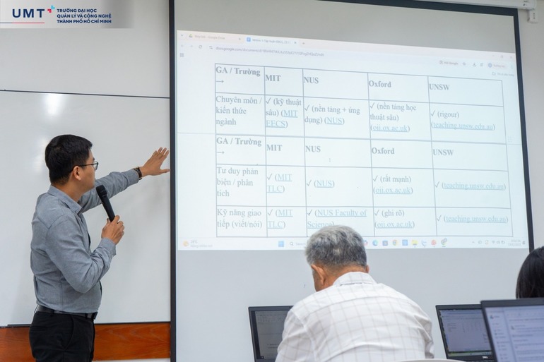 Dưới sự gợi mở của hai chuyên gia TS. Nguyễn Quốc Chính và ThS. Nguyễn Thị Huyền, các nhóm giảng viên thuộc từng lĩnh vực đào tạo đã tích cực thảo luận, tranh biện và thực hành xây dựng khung năng lực cụ thể. Những bảng biểu, sơ đồ tư duy được lấp đầy bởi những ý tưởng tâm huyết của đội ngũ sư phạm UMT, nhằm đảm bảo tính nhất quán (Constructive Alignment) trong toàn bộ hệ thống: từ Mục tiêu đào tạo – Nội dung giảng dạy đến Đánh giá kết quả học tập.