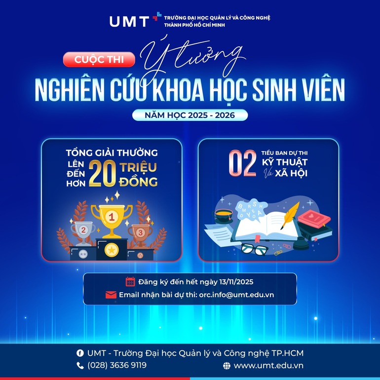 Tiếp nối thành công của Cuộc thi Ý tưởng nghiên cứu khoa học sinh viên UMT 2024 - 2025, Trường Đại học Quản lý và Công nghệ TP.HCM (UMT) chính thức phát động Cuộc thi “Ý tưởng nghiên cứu khoa học sinh viên 2025 - 2026.