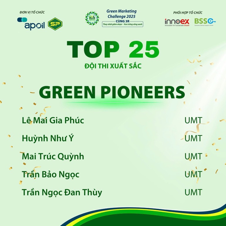 Vượt qua hàng trăm đội thi trên toàn quốc, đội Green Pioneers đến từ UMT đã xuất sắc ghi danh vào Top 25 của cuộc thi Green Marketing Challenge 2025. Đây là sân chơi hàng đầu dành cho những bạn trẻ đam mê Marketing bền vững, với sứ mệnh lan tỏa thông điệp "Tiêu thụ giảm nhựa – Vun trồng sống xanh".
