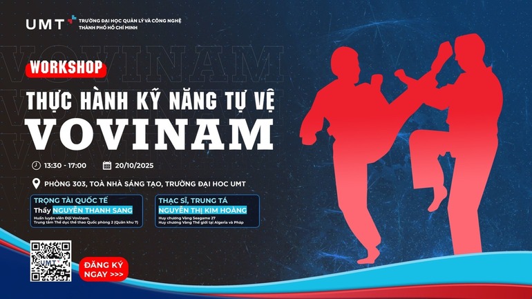 Nhằm trang bị cho sinh viên những kiến thức và kỹ năng tự vệ cơ bản, giúp nâng cao ý thức bảo vệ bản thân, chủ động phòng tránh các tình huống nguy hiểm trong cuộc sống, Trường Đại học UMT tổ chức Workshop “Thực hành Kỹ năng Tự vệ – Vovinam” vào lúc 13:30 ngày 20/10/2025.