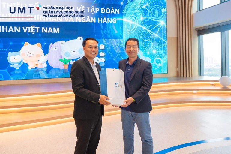 Anh Nguyễn Tiến Dũng - Giám đốc Chi nhánh An Đông, Shinhan Bank cũng thay mặt Ngân hàng gửi quà lưu niệm đến đại diện Trường Đại học UMT: ThS. Bùi Phan Khánh - Trưởng Bộ phận Phát triển năng lực sinh viên.