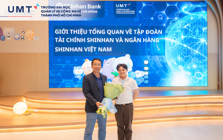 Đại diện sinh viên UMT gửi hoa cảm ơn đến đại diện Shinhan Bank: Anh Nguyễn Tiến Dũng - Giám đốc Chi nhánh An Đông.