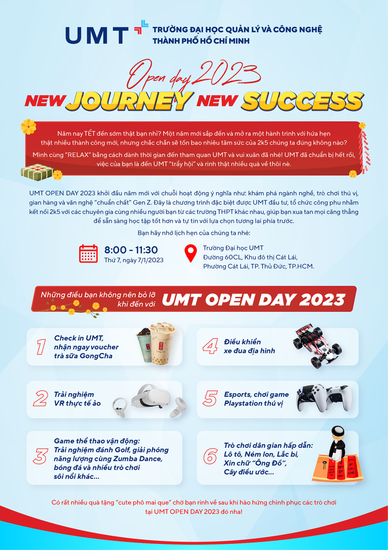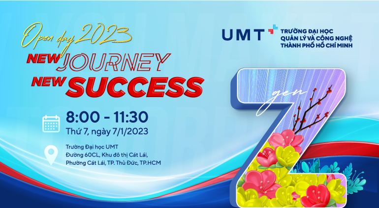 “New Journey, New Success 2023” sẽ được tổ chức vào ngày 7/1/2023, đây là Ngày hội kết hợp giữa Hội xuân dành cho UMTers và Open Day khám phá trường đại học dành cho các bạn học sinh THPT đang quan tâm đến UMT.