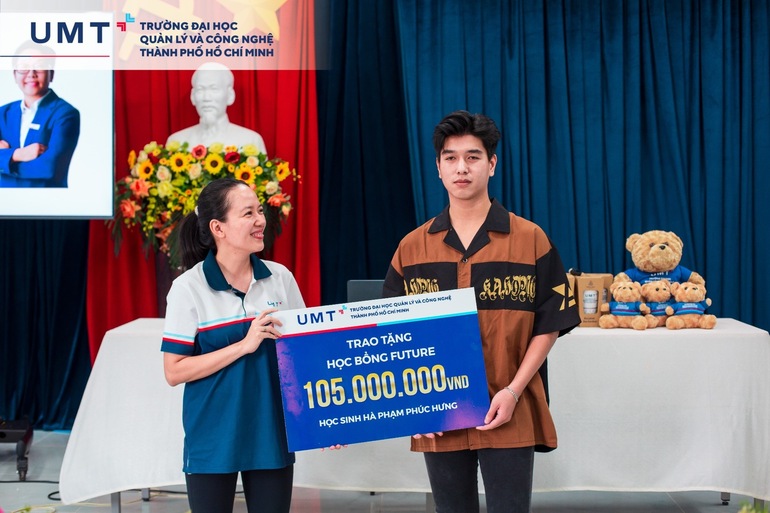 Một tin vui vô cùng đặc biệt tại Seminar, ThS. Huỳnh Thúy Phương – Phó Chủ tịch Hội đồng Trường, Phó Hiệu trưởng Điều hành UMT, đã đại diện UMT trao tặng em Hà Phạm Phúc Hưng – học sinh lớp 12 Trường Phổ thông Duy Tân suất học bổng Future trị giá 105 triệu đồng.