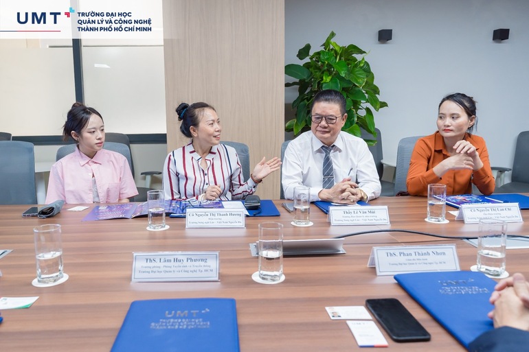 Đại diện Trường Song ngữ Lào – Việt Nam Nguyễn Du có Cô Nguyễn Thị Thanh Hương - Hiệu trưởng, Cô Nguyễn Thị Lan Chi – Phó Hiệu trưởng và Thầy Lê Văn Mùi - Trưởng Ban quản lý Nhà trường. Tiếp đón đoàn có PGS. TS. Trần Đan Thư - Trưởng Khoa Công nghệ, TS. Trần Nam Quốc - Trưởng Khoa Kinh doanh, TS. Nguyễn Trà Giang - Viện trưởng Viện KH và QLTDTT, TS. Bùi Thị Lan Hương - Trưởng phòng Đối ngoại và Quản lý nghiên cứu khoa học cùng các GVNV UMT.
