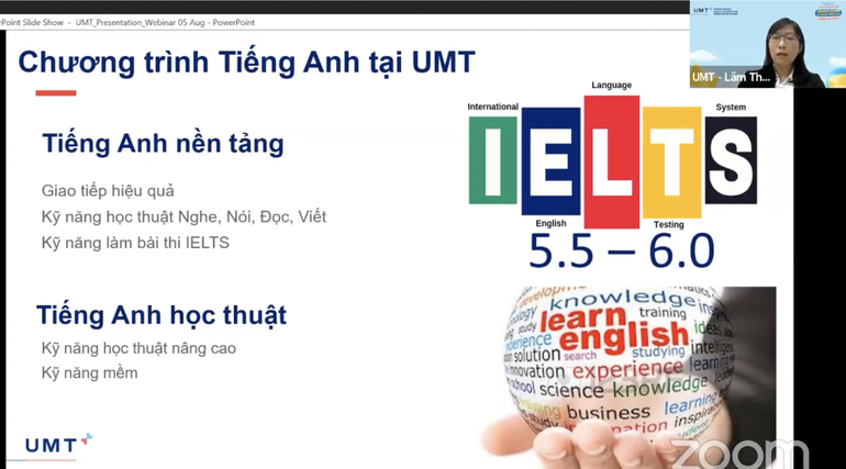 Tiếng Anh chính là công cụ để các bạn trở thành công dân toàn cầu, nhưng rất nhiều bạn học sinh chưa tìm được phương pháp học Tiếng Anh hiệu quả. Do đó, ngày 5/8/2022, Trường Đại học UMT đã tổ chức Webinar trực tuyến trên Zoom và livestream trên Fanpage để giúp các tân sinh viên có bí quyết học tập và cải thiện Tiếng Anh khi lên đại học.
